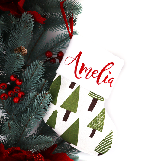 Embroidered Christmas stocking custom name initials (trees on linen)Regular price $19.50 USDRegular priceUnit price / per-